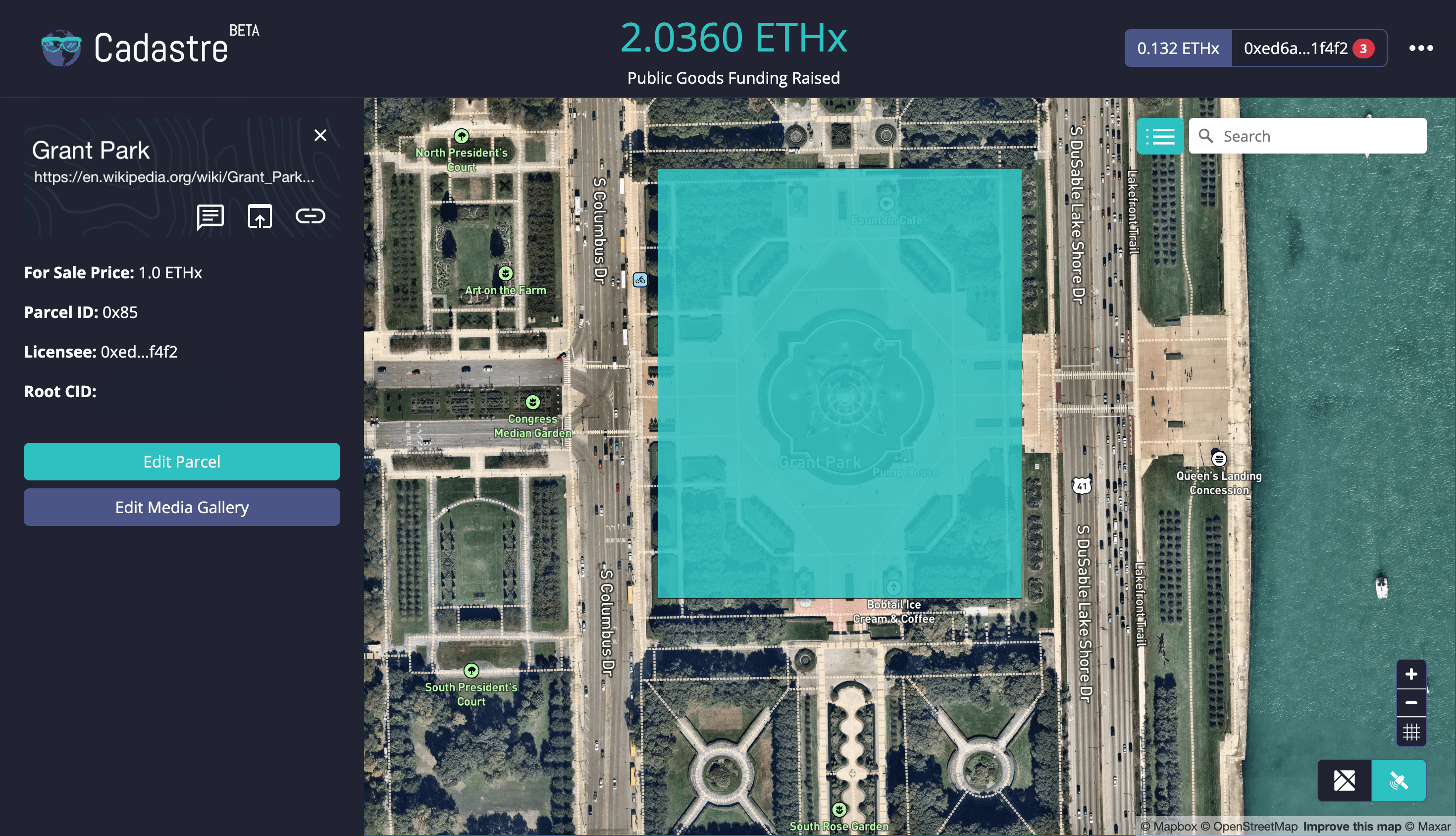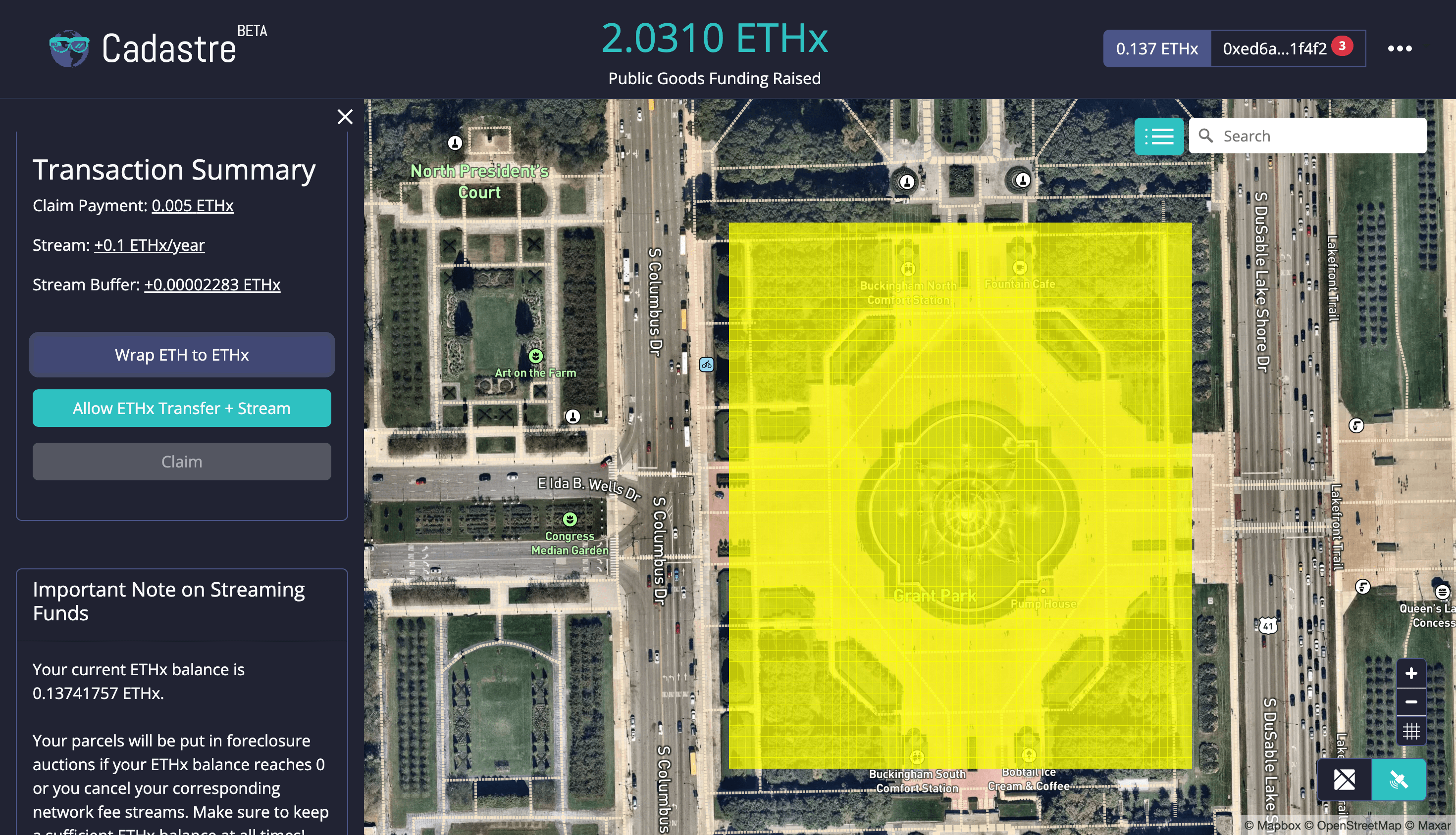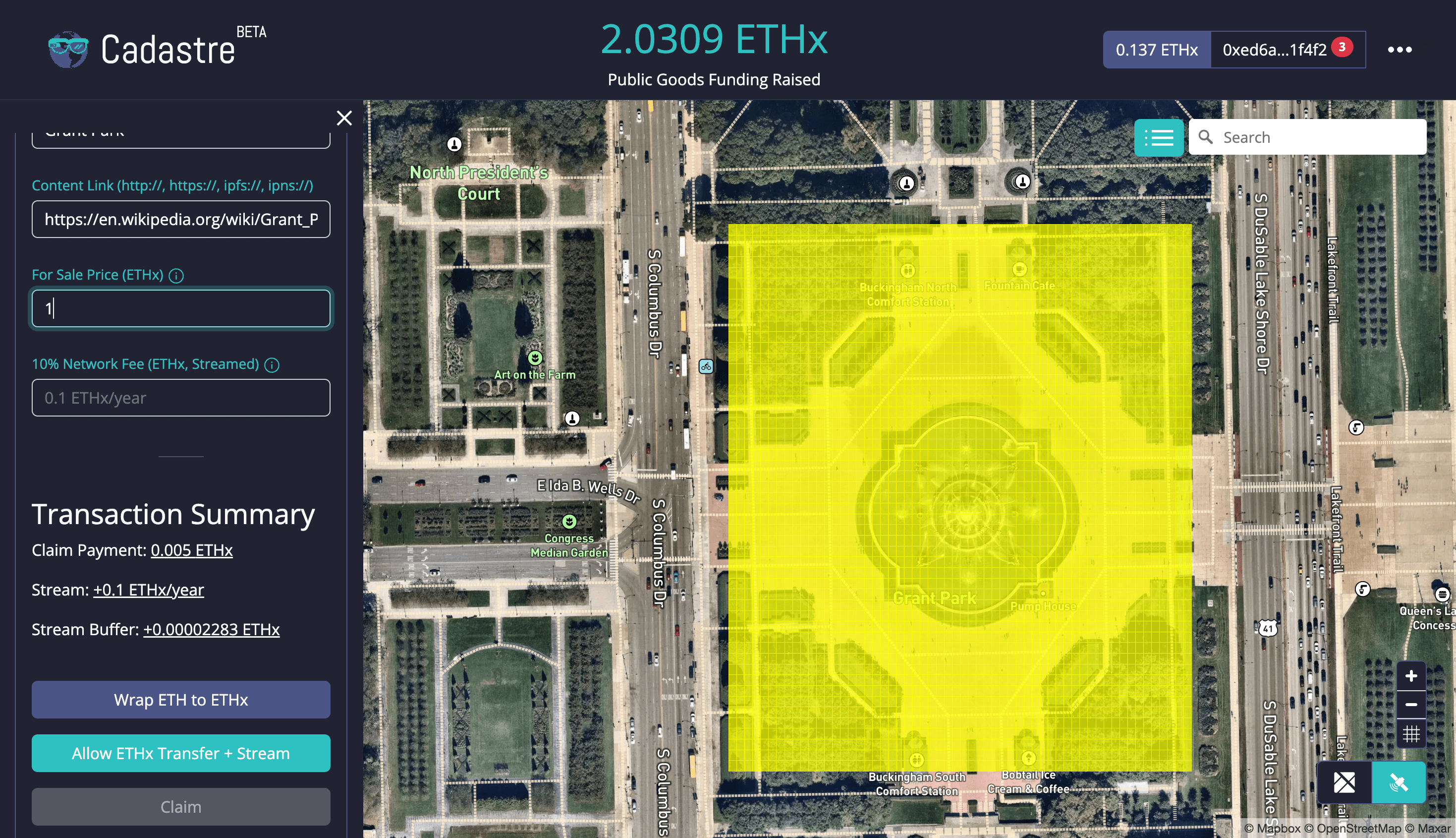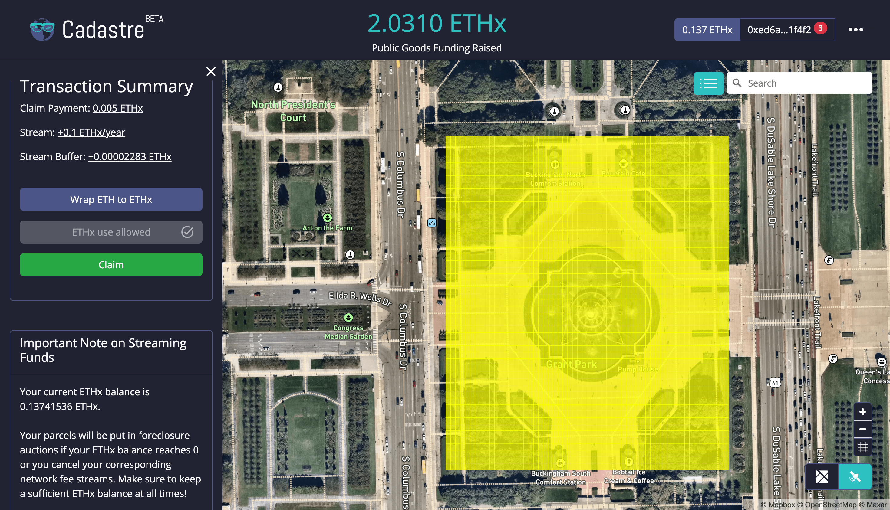 Reminder: All parcel claims require an upfront payment of 0.001 ETHx. Your ongoing fee stream is variable based on your For Sale Price. All funds go to supporting public goods!