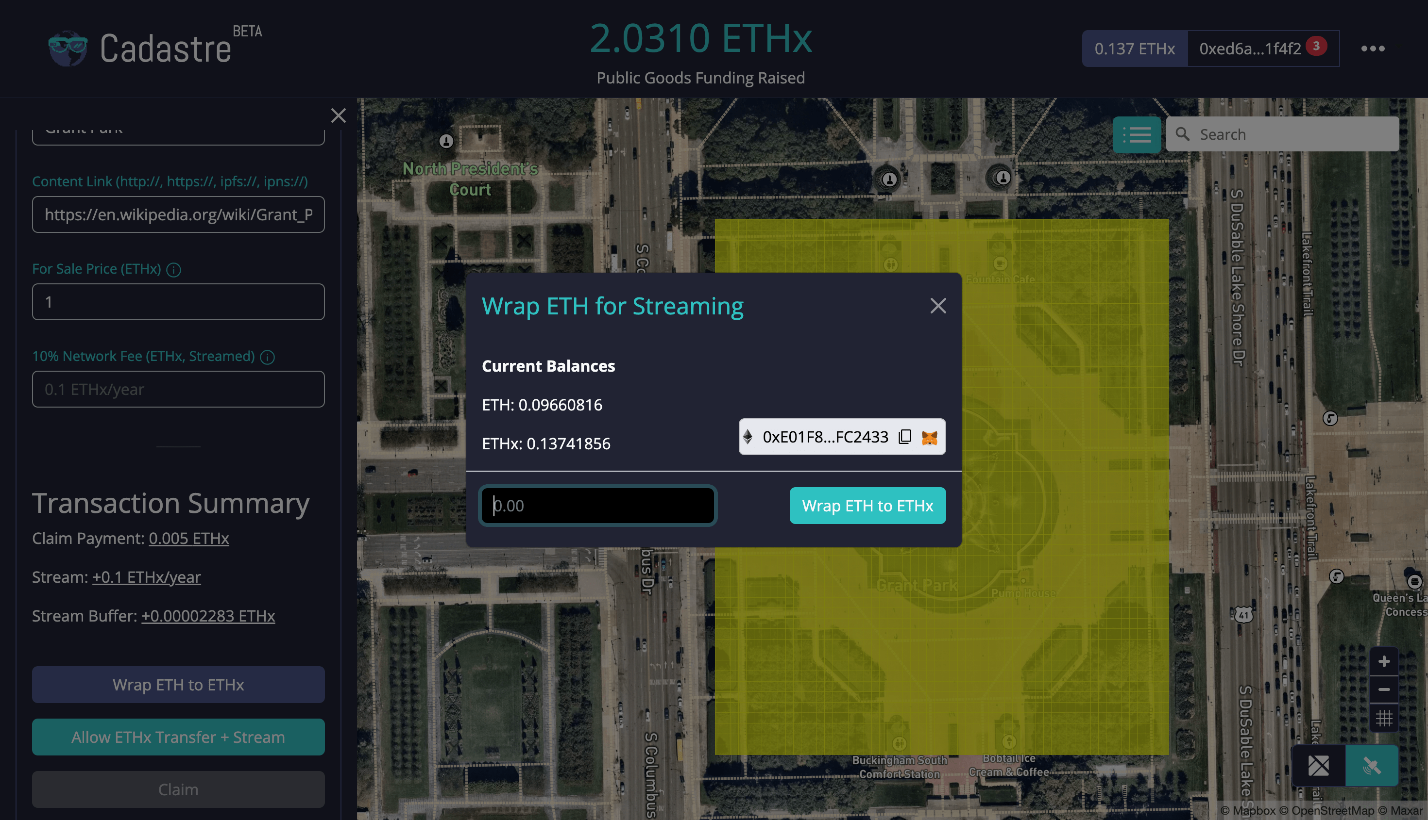 6. All payments and streams in the Geo Web land market are made in ETHx—a super token-wrapped version of ETH. If you don't have enough ETHx to complete the claim transaction AND maintain a non-zero balance for a reasonable period of time (streams deduct from your balance every second!), then you can Wrap ETH to ETHx by clicking the purple button in the Transaction Panel and submitting a transaction with the desired value in the modal. Make sure to leave enough ETH to pay for gas on multiple transactions!